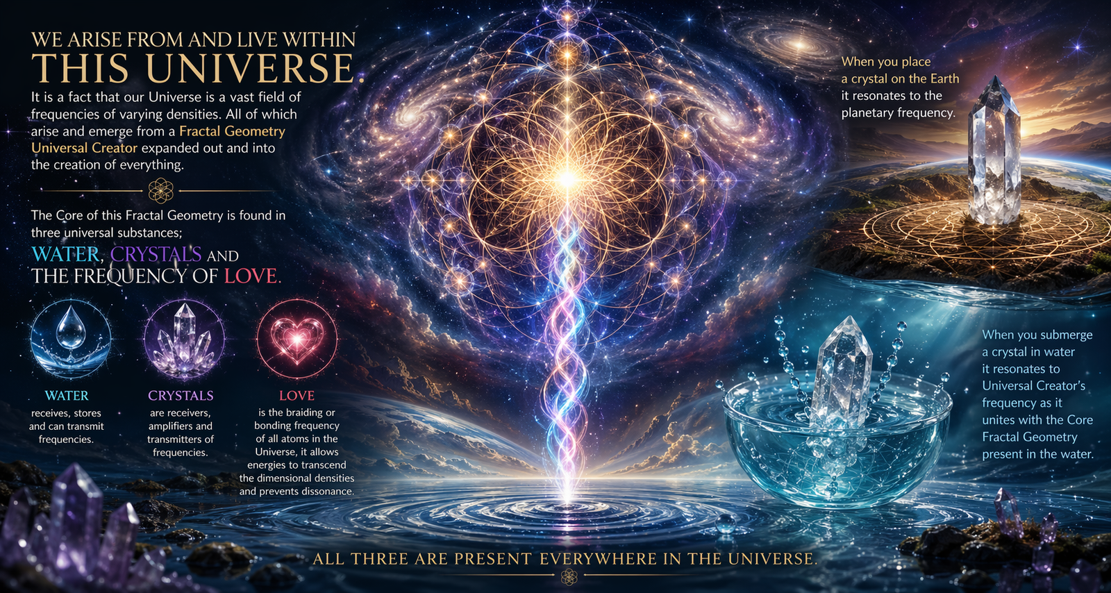 We arise from and live within this Universe. It is a fact that our Universe is a vast field of frequencies of varying densities. All of which arise and emerge from a Fractal Geometry Universal Creator expanded out and into the creation of everything. The Core of this Fractal Geometry is found in three universal substances; Water, Crystals and the Frequency of Love. Love is the braiding or bonding frequency of all atoms in the Universe, it allows energies to transcend the dimensional densities and prevents dissonance. Crystals are receivers, amplifiers and transmitters of frequencies. Water recieves, stores and can transmit frequencies. All three are present everywhere in the Universe. When you place a crystal on the Earth it resonates to the planetary frequency. When you submerge a crystal in water it resonates to Universal Creator’s frequency as it unites with the Core Fractal Geometry present in the water.